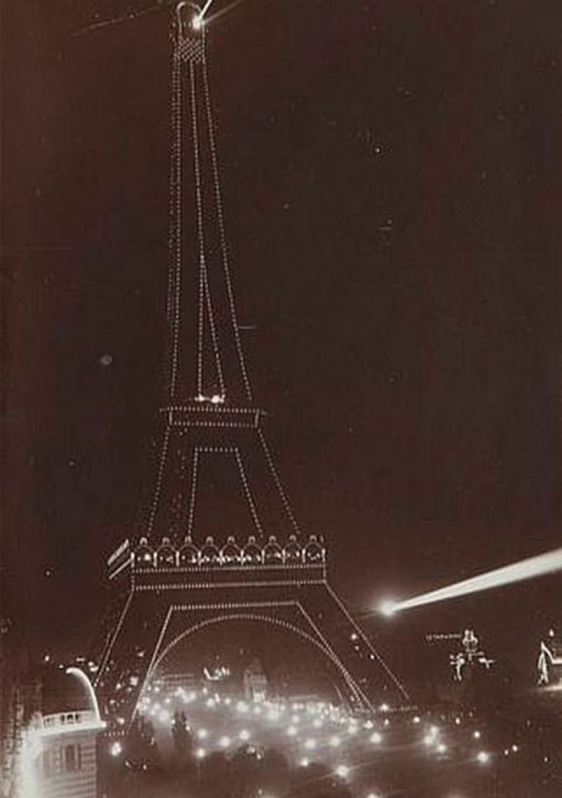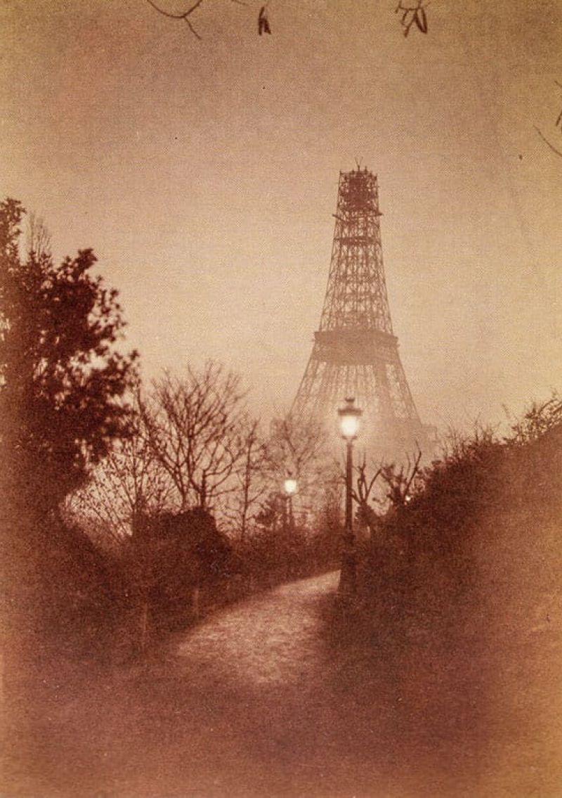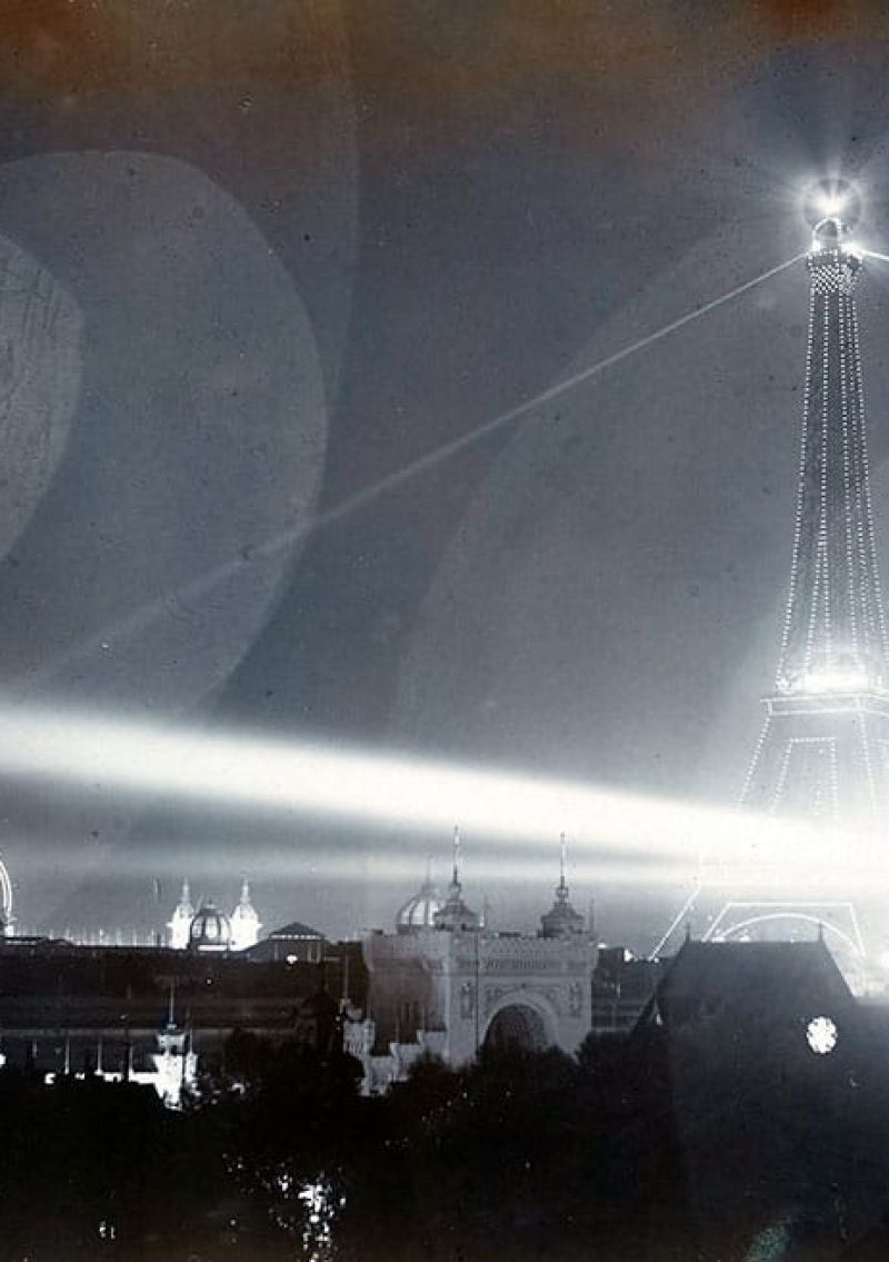 L’intérêt des photographes pour la tour Eiffel ne cesse pas avec la fin des travaux. Du balcon de l’appartement de Gabriel Loppé, avenue du Trocadéro (actuellement avenue du Président Wilson), le monument constitue un motif privilégié, qu’elle soit illuminée de guirlandes ou, comme ici, révélée par les éclairs d’un ciel d’orage.